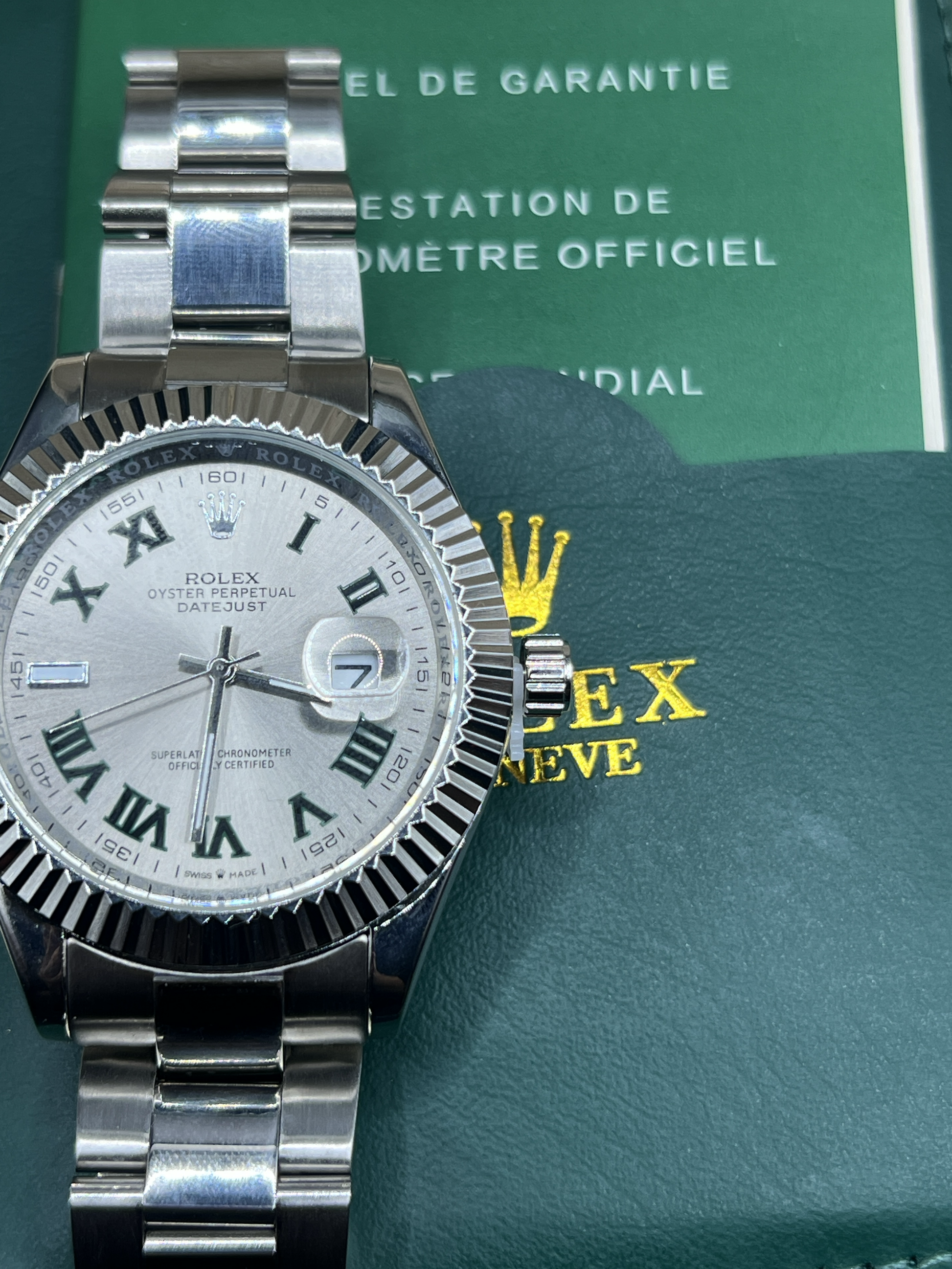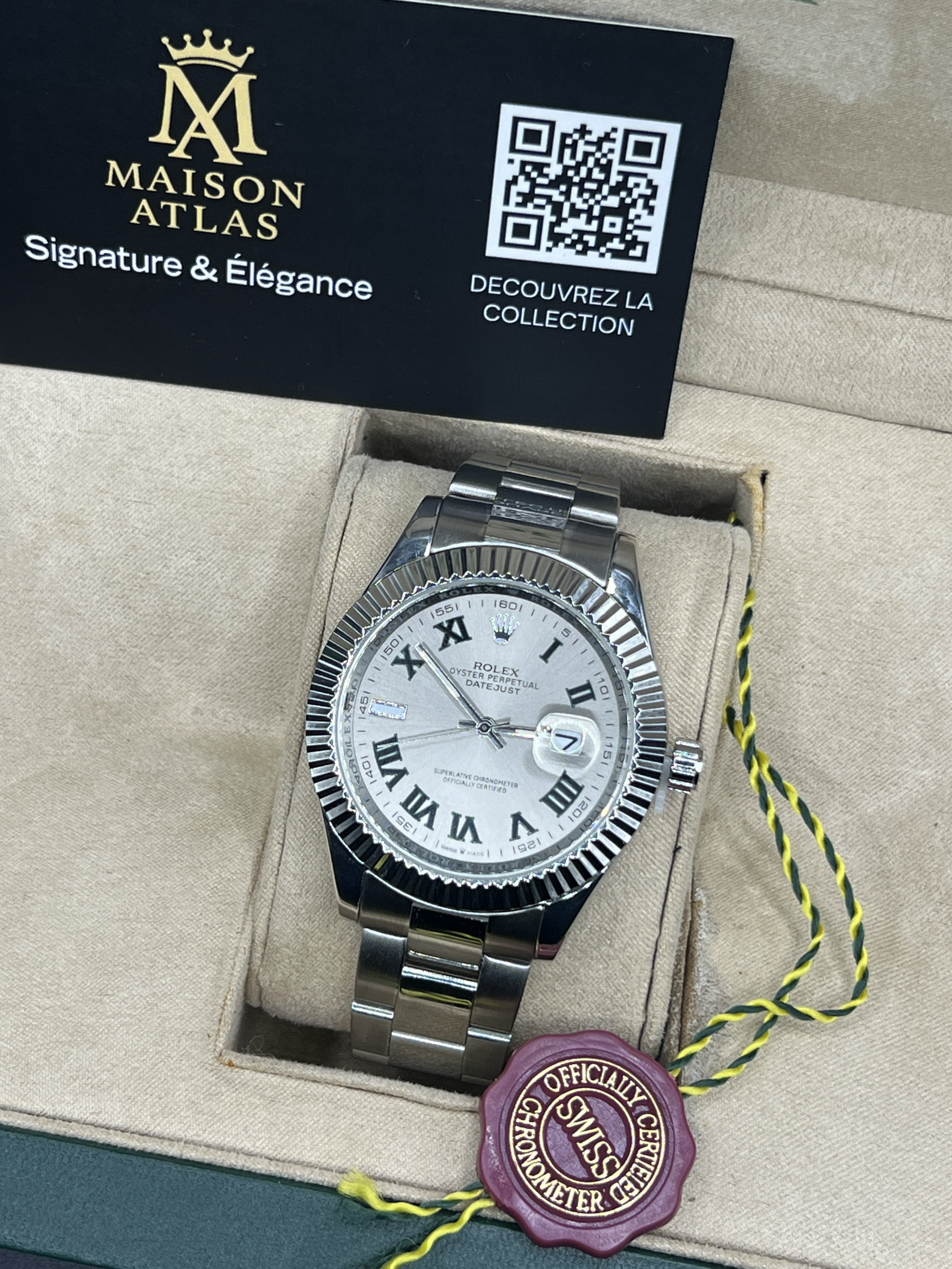 Élégance et précision réunies : la Rolex Datejust Argent Impérial séduit par son cadran argenté orné de chiffres romains polis, sa lunette cannelée emblématique et son bracelet Oyster robuste.