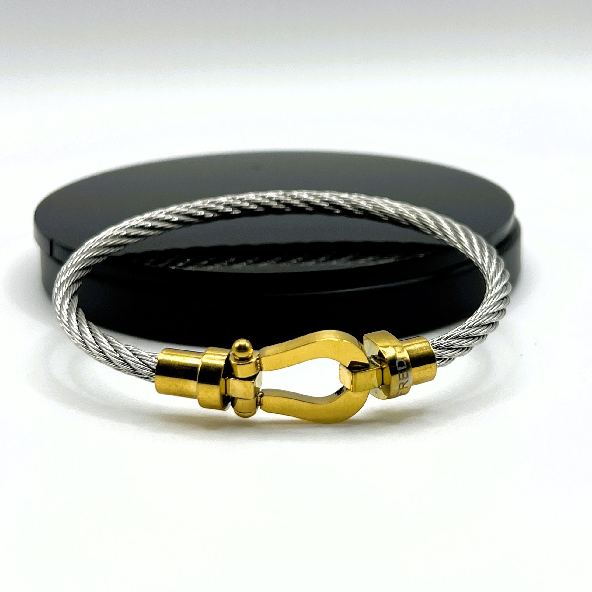 Le bracelet Élite Bicolore – Câble Large marie la brillance de l’acier inoxydable argenté à la noblesse de ses finitions dorées. Avec son câble large, il s’impose comme une pièce forte et prestigieuse, parfaite pour un style affirmé et raffiné.