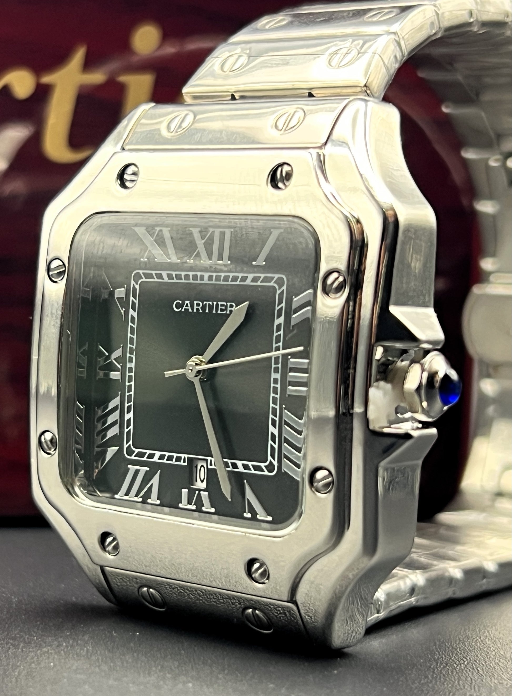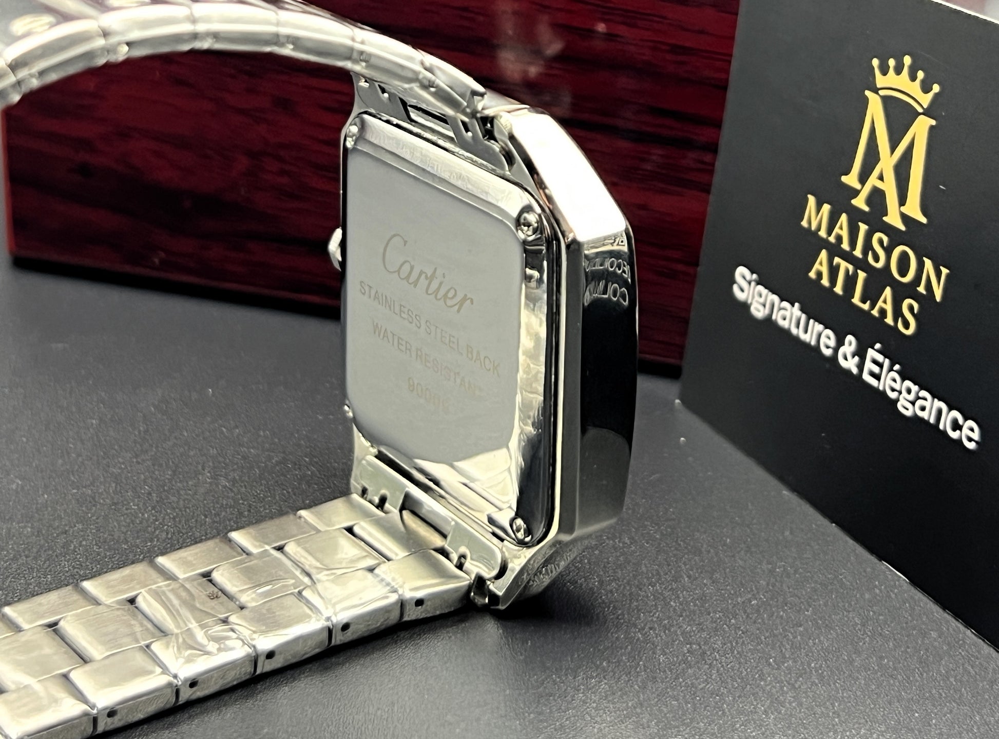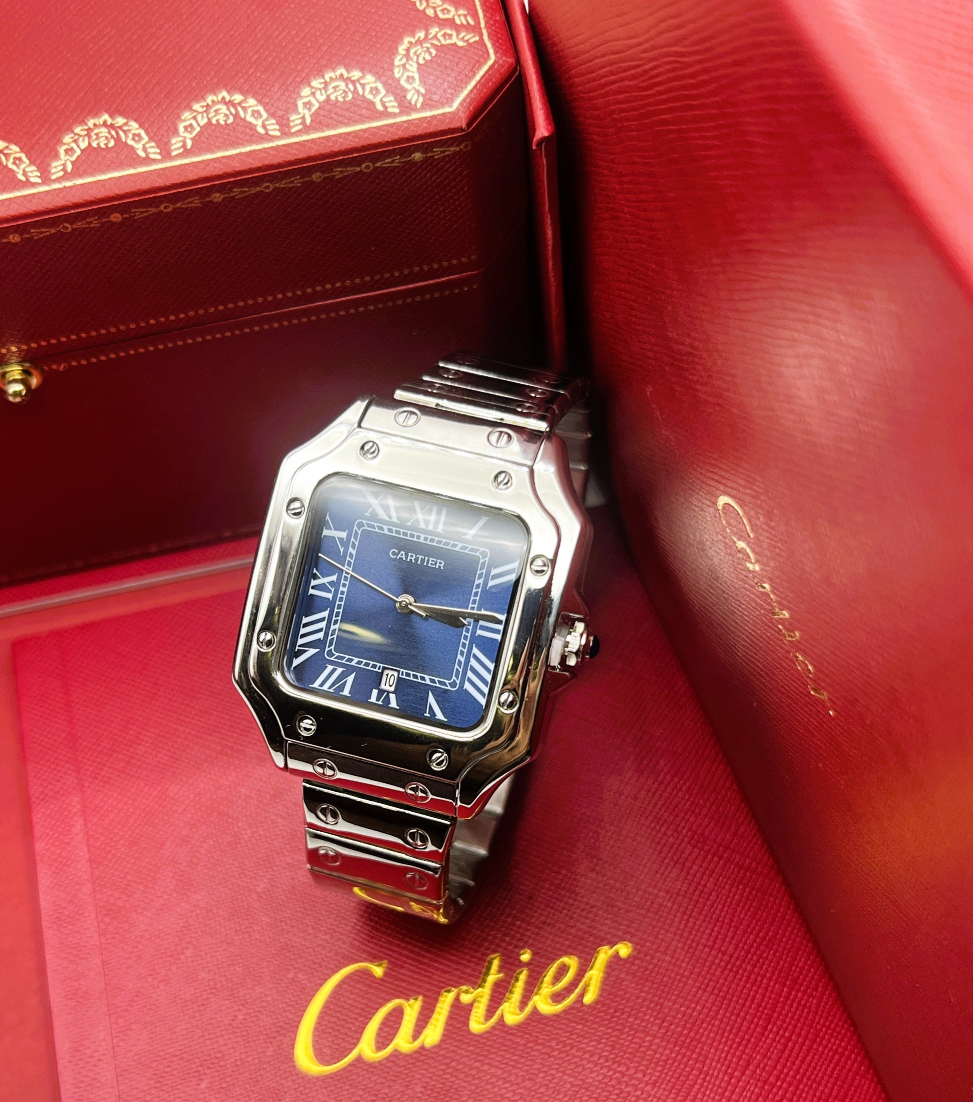 Une montre au côté luxe moderne , avec son boîtier carré en acier et son cadran bleu ou noir profond qui tient le regard. Livrée dans un packaging premium rouge , elle incarne distinction et originalité.