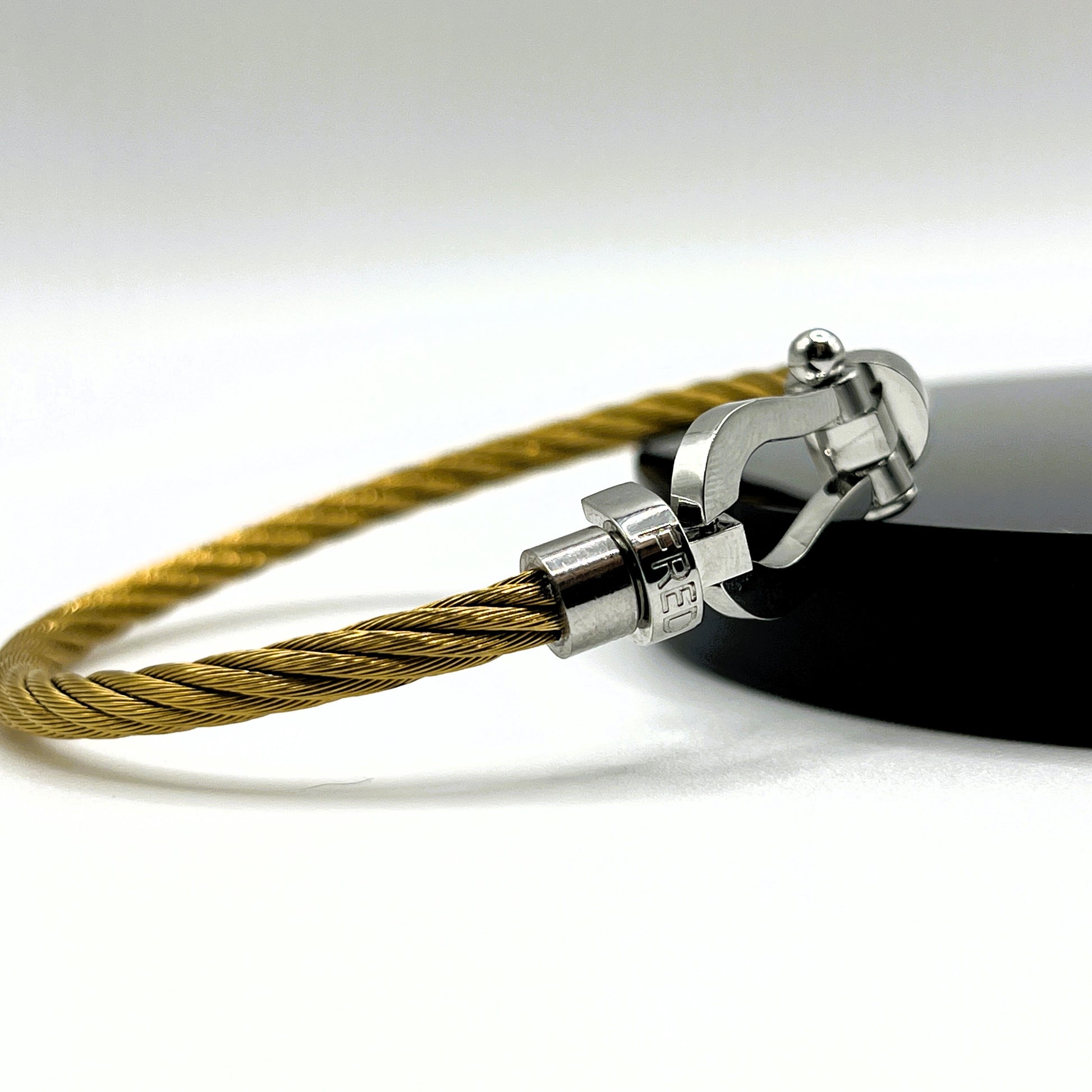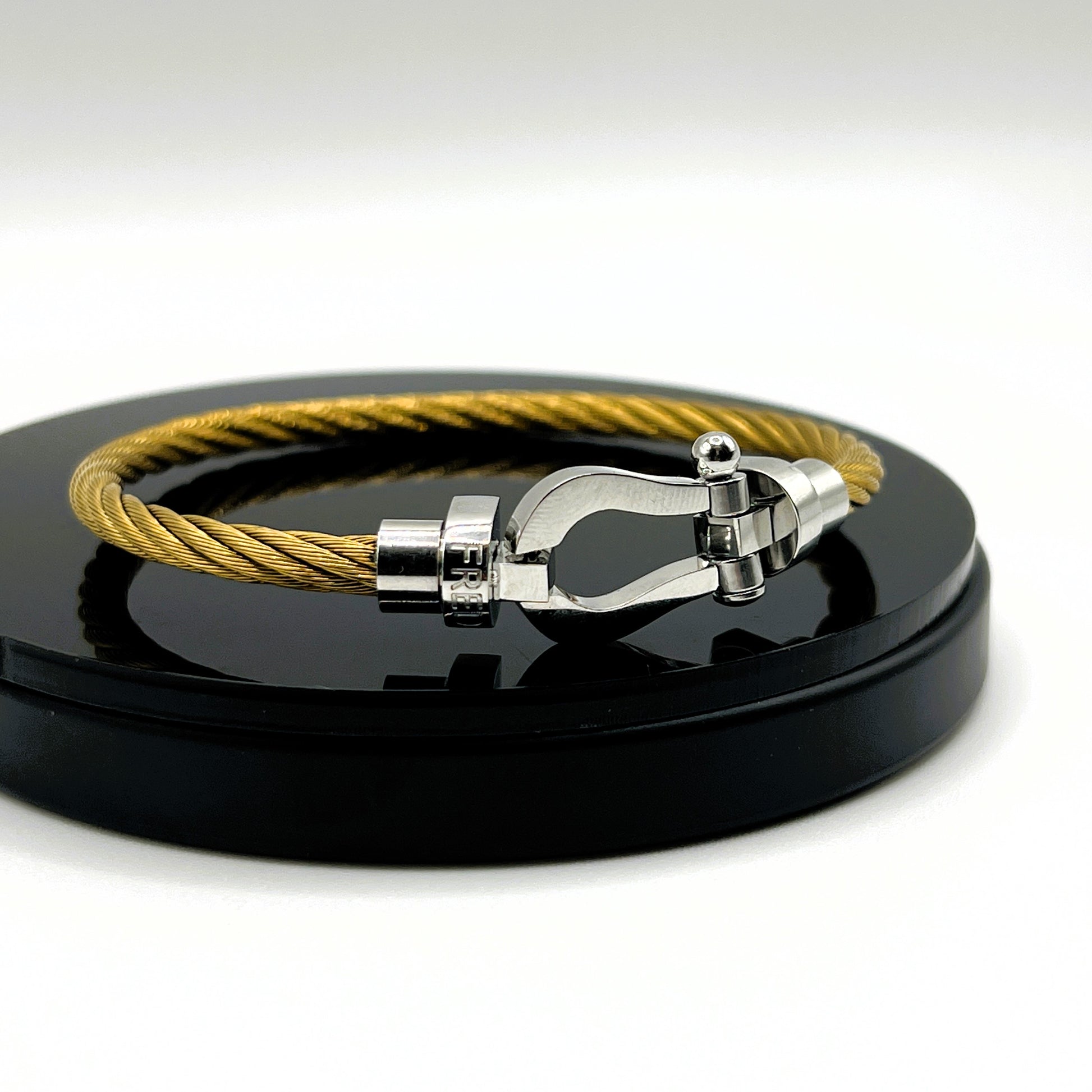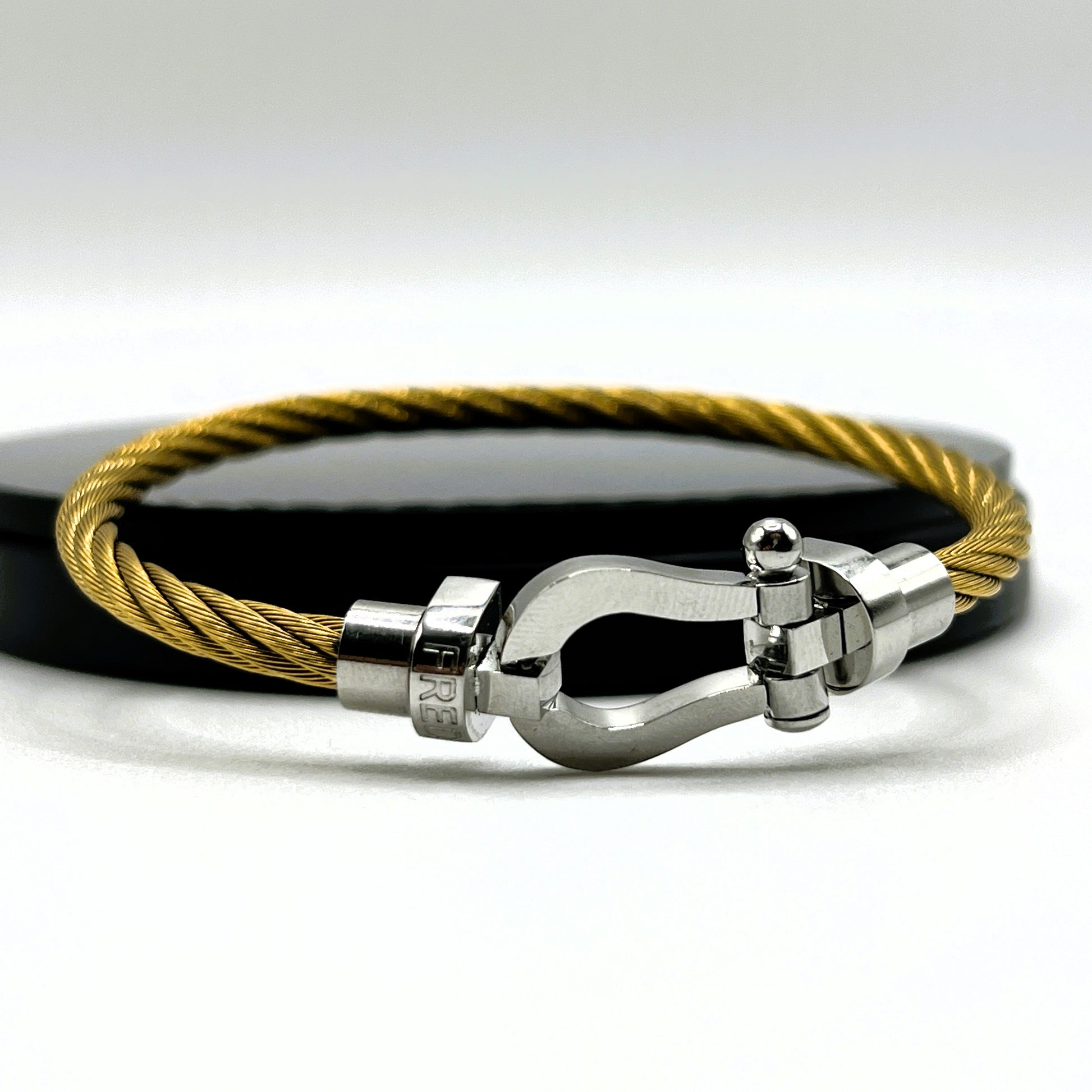Le bracelet Éclat Royal – Câble Large associe la brillance d’un câble doré en acier inoxydable à l’élégance de ses finitions argentées. Avec son câble large, il affirme un style puissant et luxueux, idéal pour un look distingué et moderne.