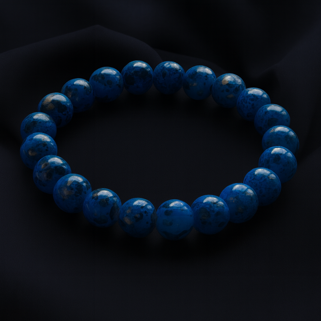 Un bracelet audacieux bleu en perles jaunes éclaboussées de noir, au style unique et urbain. Idéal pour ceux qui aiment se démarquer avec des accessoires originaux.