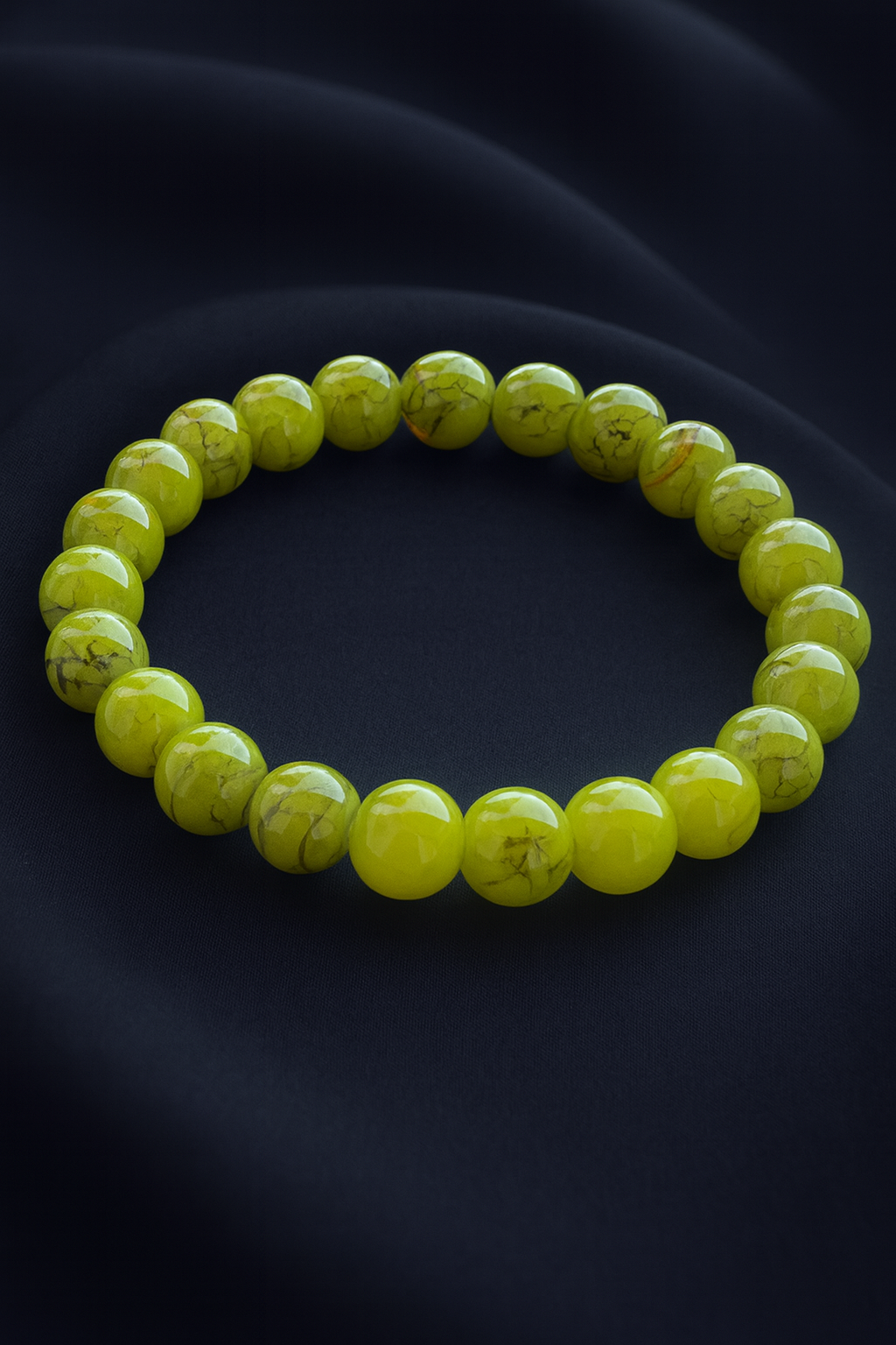 Un bracelet éclatant en perles jaunes marbrées qui apporte lumière et énergie. L’accessoire parfait pour un look audacieux et plein de vitalité.